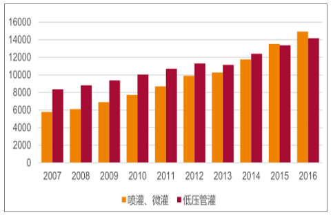 目前,我國水澆地主要用于種植小麥、玉米、大豆等糧食作物,適合發展噴灌。此外,2013年,我國有園地1.45億畝,草場22.5億畝,草場適宜發展噴灌,園地主要以種植蔬菜、瓜果等經濟作物為主,事宜發展噴灌和微灌。假設未來噴灌、微灌占灌溉面積的比重達到發達國家水平,即占到耕地和園地的比重達到70%,則我國噴灌和微灌的推廣面積將高達5.22億畝,我們假設牧草地實現噴灌的比例達到10%,則可實現噴灌面積達到2.25億畝。合計7.47億畝,而2016年,我國噴灌和微灌面積合計僅有1.5億畝左右,未來成長空間巨大。