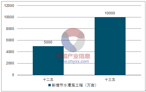 建設面積方面,根據國家農業節水綱要(2012-2020)的規劃,到2020年全國農田有效灌溉面積達到10億畝,新增節水灌溉工程面積3億畝,其中新增高效節水灌溉工程面積1.5億畝以上。“十三五”期間,國家將新增高效節水灌溉面積1億畝,較“十二五”期間新增5000萬畝量翻一倍。