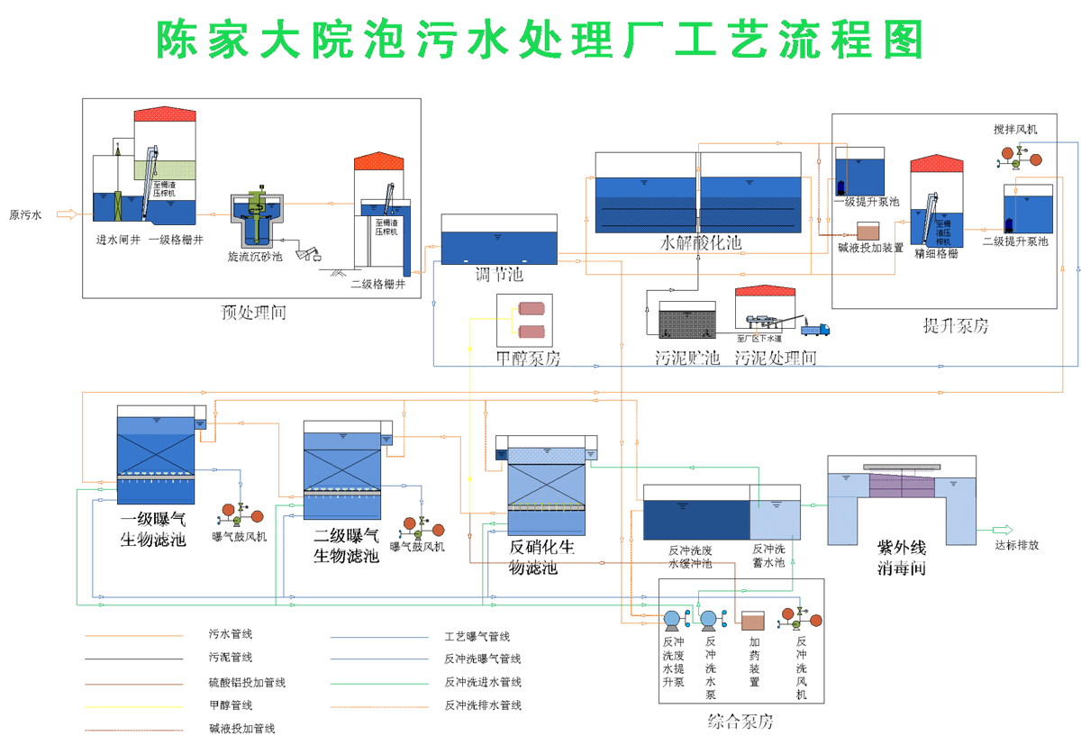 該污水處理廠主體工藝由預(yù)處理間、調(diào)節(jié)池、提升泵房、水解酸化池、一級曝氣生物濾池、二級曝氣生物濾池和反硝化生物濾池、紫外線消毒間等構(gòu)筑物組成。其中曝氣生物濾池采用我公司專利技術(shù)“后置反硝化脫氮工藝”。出水水質(zhì)可達(dá)到國家《城鎮(zhèn)污水處理廠污染物排放標(biāo)準(zhǔn)》(GB18918-2002)中的一級A類標(biāo)準(zhǔn)。