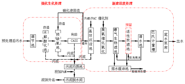 我司于2018年6月與國星生化公司簽訂該污水廠提標改造工程設計采購施工合同,2019年8月完成水質調試驗收工作。改造后處理工藝采用:水解酸化(改造)+CASS工藝(改造)+高效沉淀池(新建)+臭氧催化氧化(新建)+曝氣生物濾池工藝(新建),出水為《城鎮污水處理廠污染物排放標準》(GB18918-2002)一級A標準,其出水利用現狀污水管道進入當涂縣第二污水處理廠。