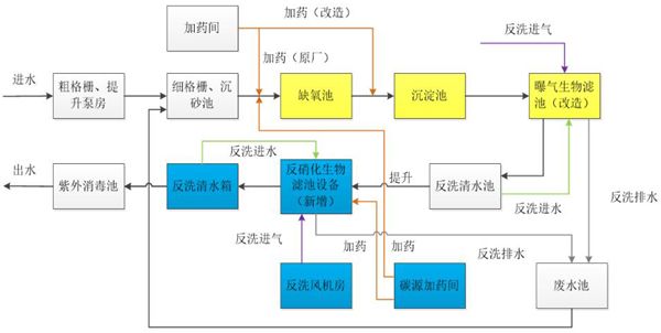仁壽縣城市生活污水處理廠改造提升工程日平均處理污水量為2.0萬立方米。廠區主體工藝采用“缺氧池、沉淀池+BAF曝氣生物濾池”處理工藝,經處理后的污水水質排放標準為《城鎮污水處理廠污染物排放標準》(GB18918-2002)一級A排放標準。改造后采用“缺氧池、沉淀池+BAF曝氣生物濾池+反硝化魔方尊”處理工藝。改造后出水指標需滿足《四川省岷江、沱江流域水污染排放標準》。